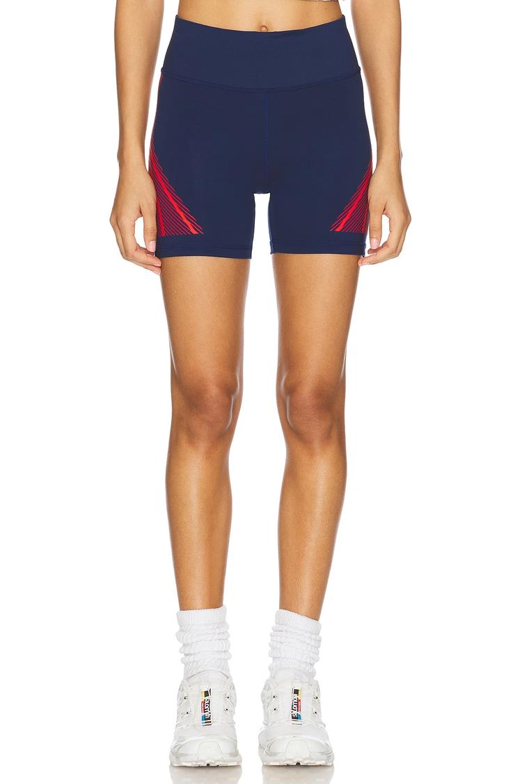 navy shorts with red side panels for athleisure