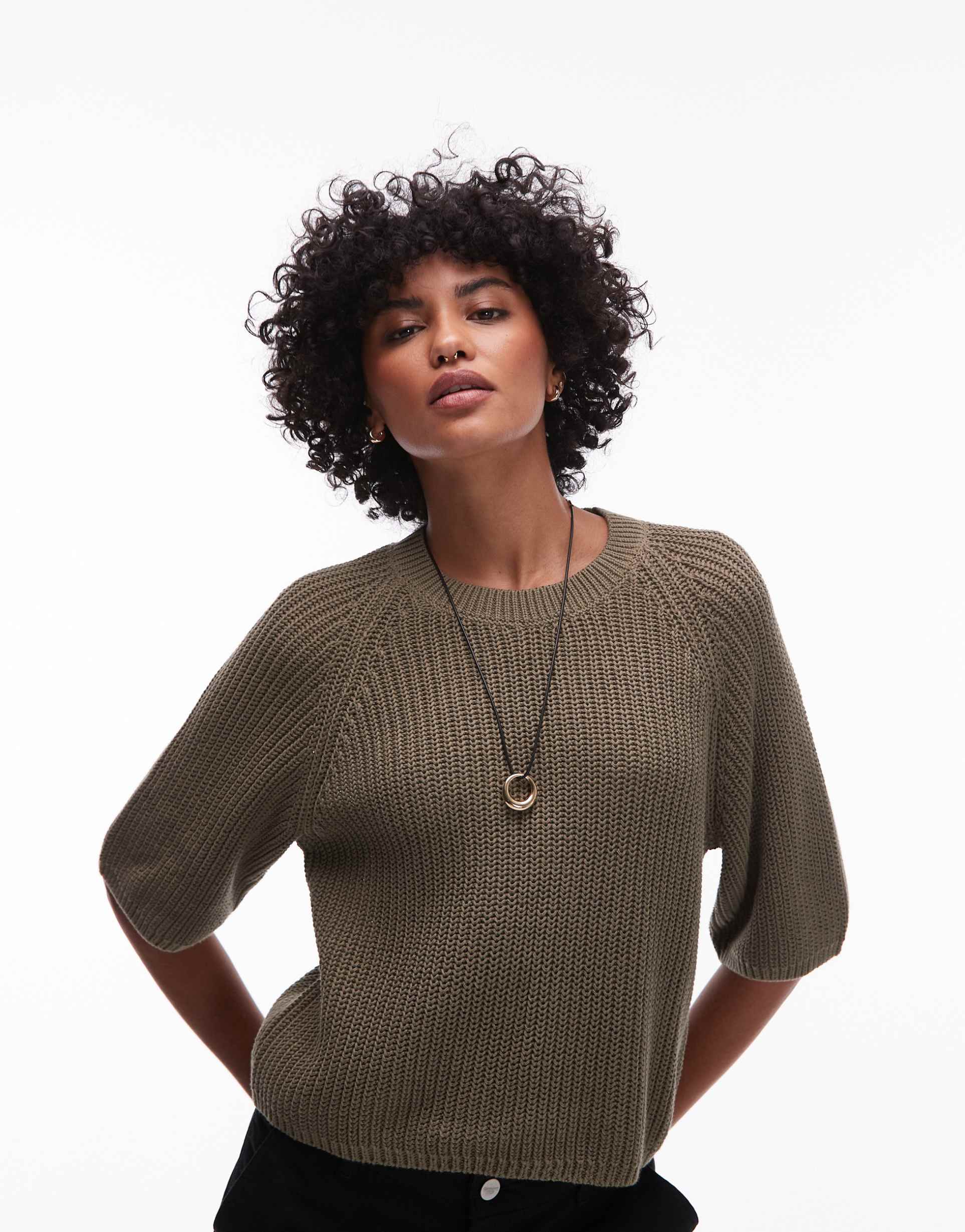 ARKET OPEN KNIT SHORT SLEEVE SWEATER IN KHAKI