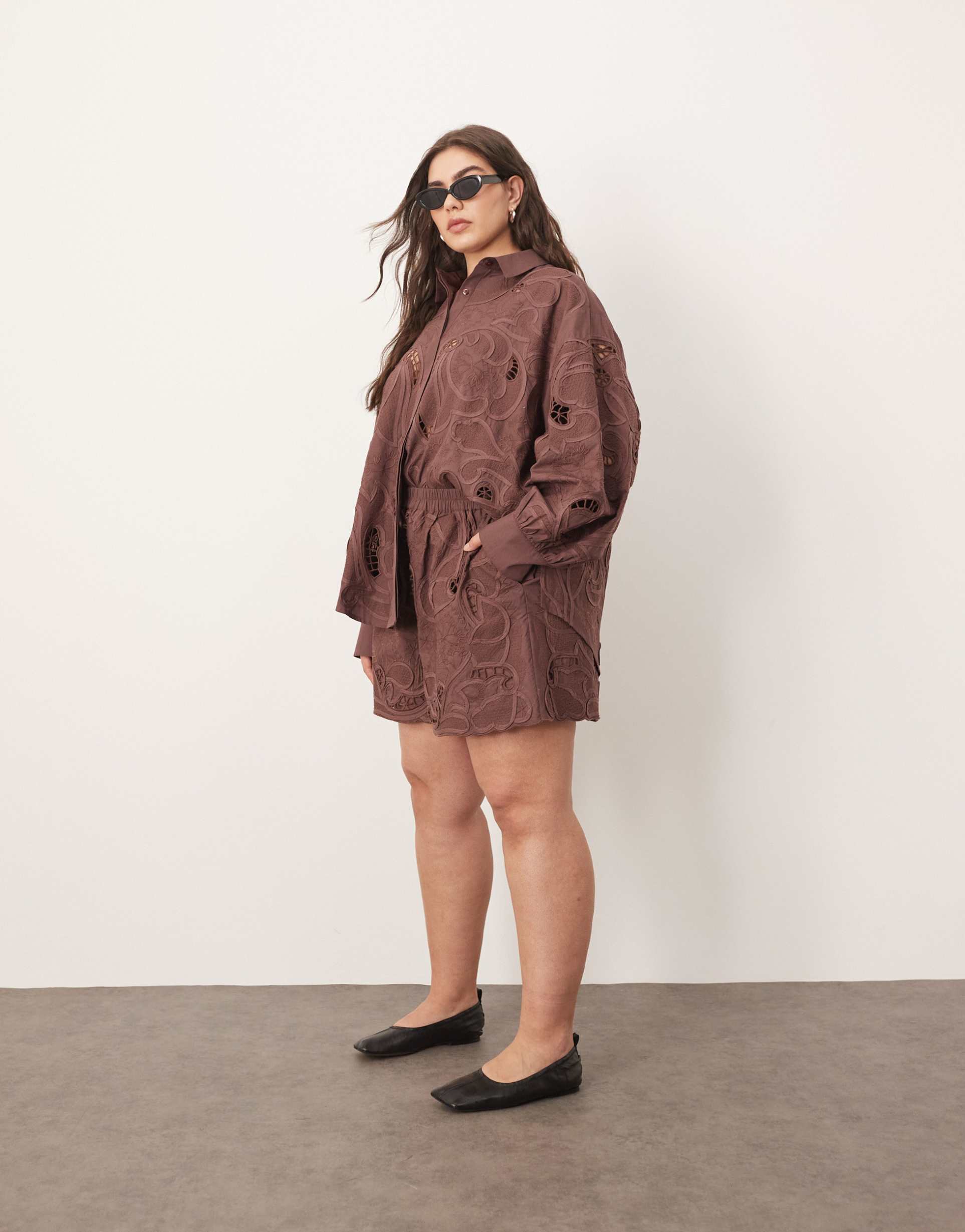 ARRANGE CURVE COTTON MIRRORED FLORAL EMBROIDERED CUTWORK SHORTS IN CHOCOLATE - PART OF A SET