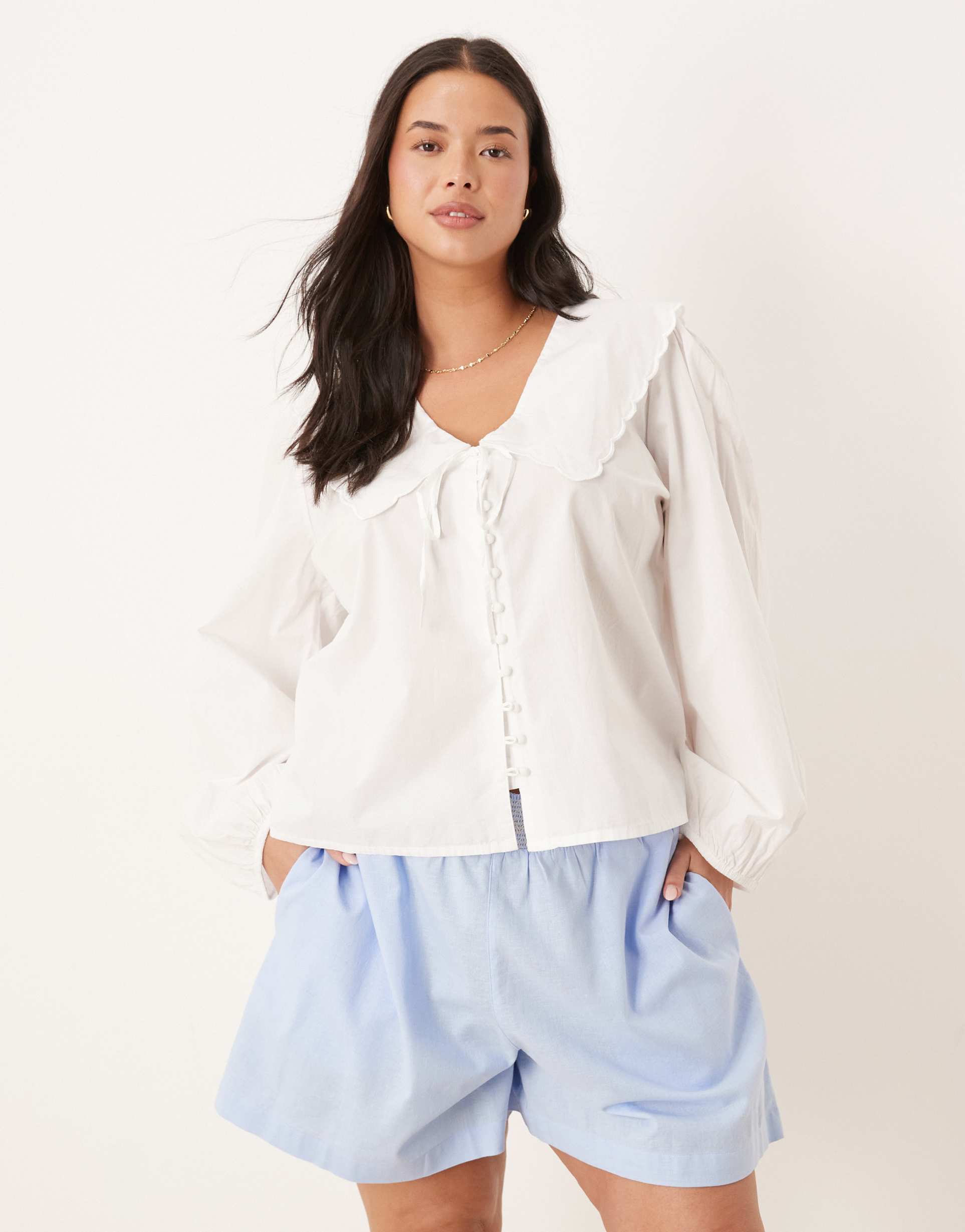 Relaxed yet refined, these ASOS Curve shorts bring summer ease into your everyday portfolio. The high-rise elasticated waist rides smooth, with a shirred front that creates soft volume and a flattering silhouette. In a light blue cotton shell with a linen-look, slubby texture, they feel breathable and offer a laid-back vibe. The wide-leg culotte cut drapes loosely over the hips and thighs, and side pockets add practical charm. Wear them with a breezy blouse for brunch, a tank for seaside strolls, or a denim jacket for cool evenings. A versatile, comfortable staple that moves with you.