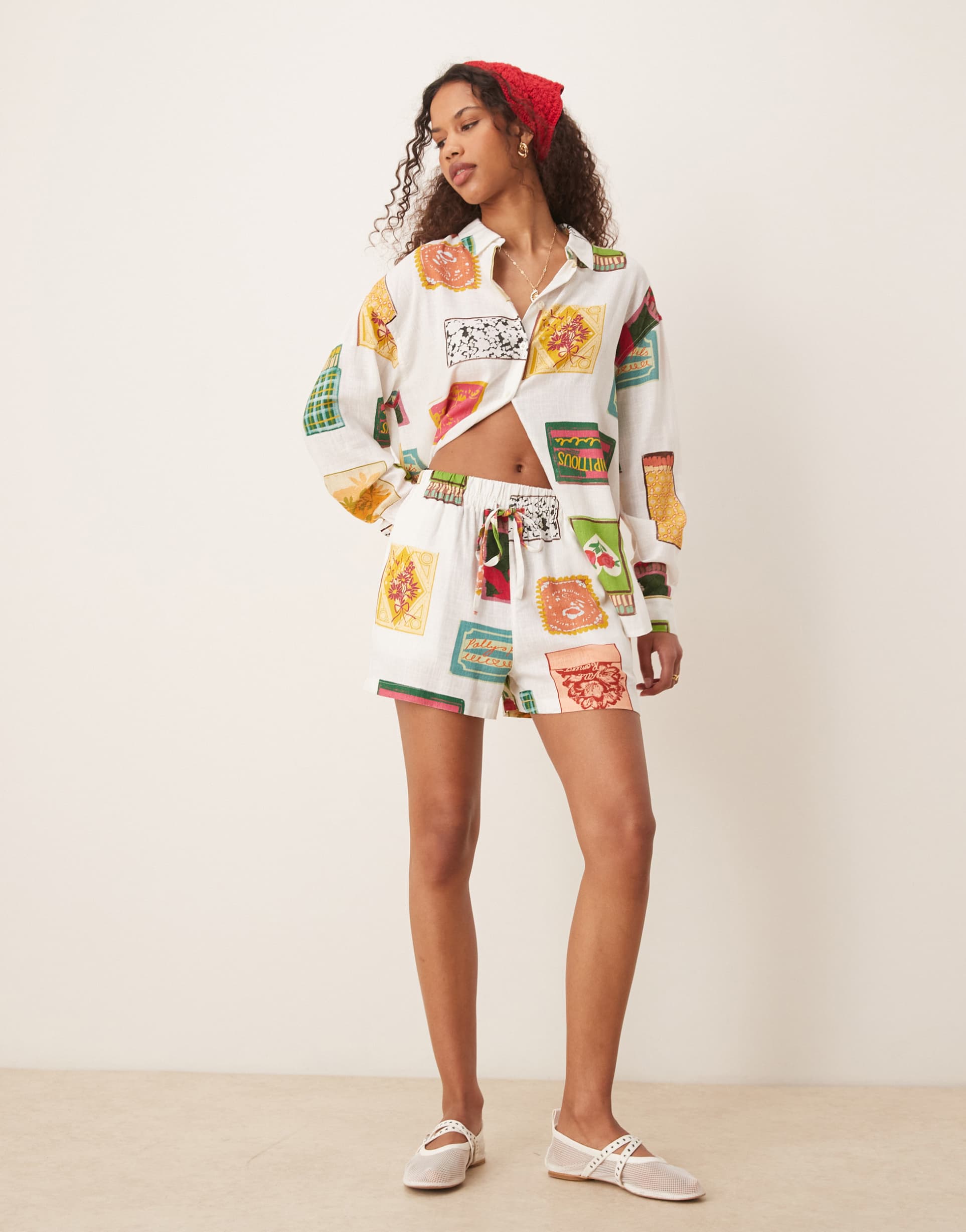 Bring a playful and vibrant touch to your warm-weather wardrobe with these ASOS DESIGN pull-on shorts crafted from a breathable linen-viscose blend. Featuring a high-rise waist with an elasticated drawstring waistband, these regular fit shorts offer both comfort and a secure fit. The all-over colorful matchbox-inspired print adds a quirky, bohemian charm that pairs perfectly with casual outings or vacation days. Practical side pockets enhance functionality while the clean hemline maintains a polished look. Ideal for spring and summer, these shorts blend easygoing style with everyday versatility, making them a standout staple for effortless chic.