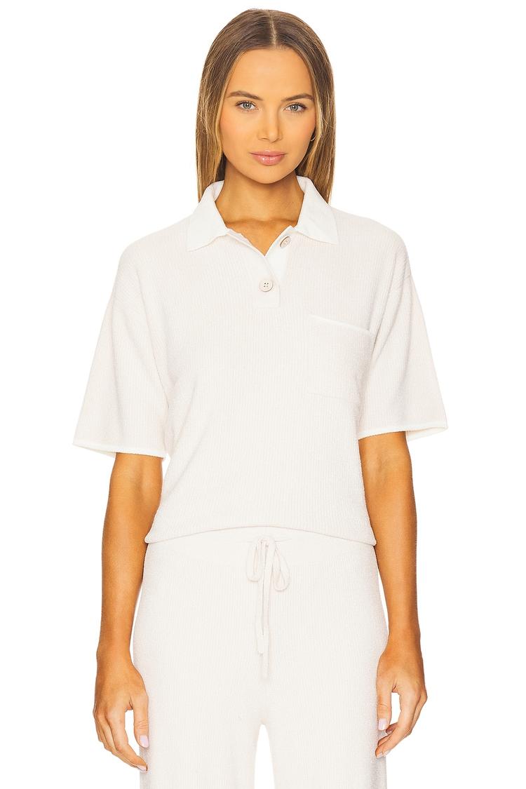Soft midweight plush knit fabric and a relaxed fit define this hip-length polo top, perfect for casual days and loungewear comfort. Featuring a classic polo collar and half sleeves with rolled edges, it offers a minimalist look with front partial button closure and a slip pocket for subtle utility. Crafted from a nylon and viscose blend, it’s ideal for travel and everyday wear, combining cozy texture with effortless style for versatile all-weather use.