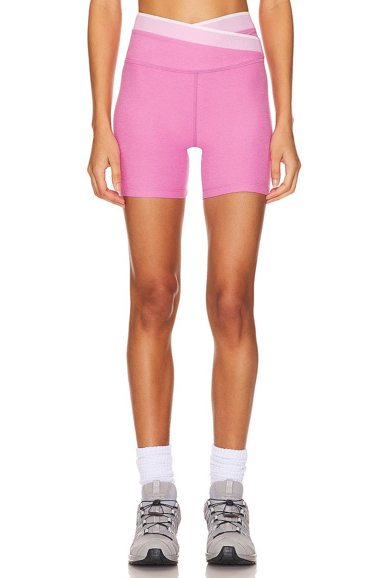 Vibrant pink Beyond Yoga Spacedye In The Mix Biker Short blends studio-grade stretch with street-ready attitude. The high-rise, elastic waistband cues a flattering silhouette, while the spacedye knit offers a second-skin feel through a polyester-elastane blend (Self: 87% polyester, 13% elastane; Lining: 94% polyester, 6% elastane). A subtle crisscross waistband detail adds a modern edge to a clean, solid pink short. Perfect for yoga, gym sessions, or casual weekend wear—pair with a cropped top and sneakers for a sleek, athletic look that moves with you.