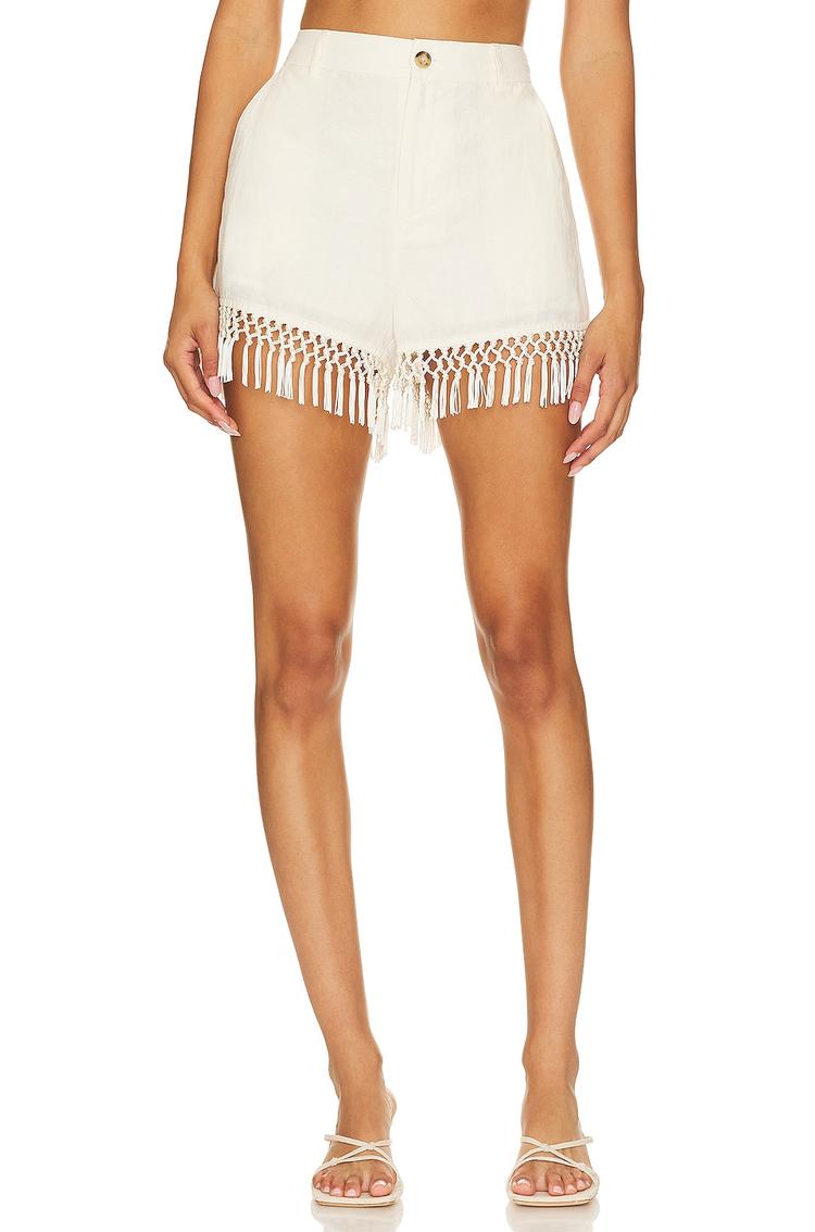 Lightweight and luxurious, these ivory linen shorts bring elevated ease to warm-weather days. A high-rise Bermuda-inspired cut sits smoothly at the waist, while a zip fly with button closure keeps the silhouette clean. The self-fabric fringe trim at the hem adds a playful, boho-chic twist, finished with practical four-pocket styling for everyday wear. Lined with a soft EcoVero lining for a silky drape, they pair effortlessly with a breezy blouse or a tailored blazer for brunch, a beach vacation, or casual city strolls. A versatile, vacation-ready staple that feels luxe and effortless.