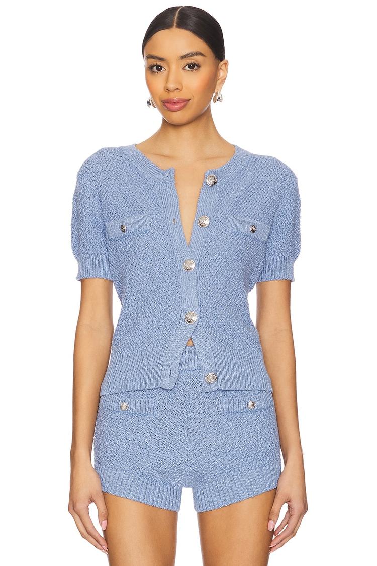 Soft seed stitch texture and a relaxed regular fit define this blouson cardigan in a matte light blue hue. Featuring a classic v-neck and half sleeves, it fastens with prominent front buttons and showcases decorative front pockets with patch details in silver tones. The hip length cut offers effortless layering for warmer seasons. Ideal for casual outings, brunch dates, or everyday wear, this cotton-polyester blend piece balances comfort with refined style for versatile wardrobe appeal.