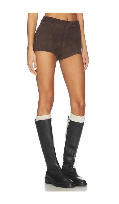 COURTNEY ZHENG LENA SUEDE MINI SHORT IN BROWN.