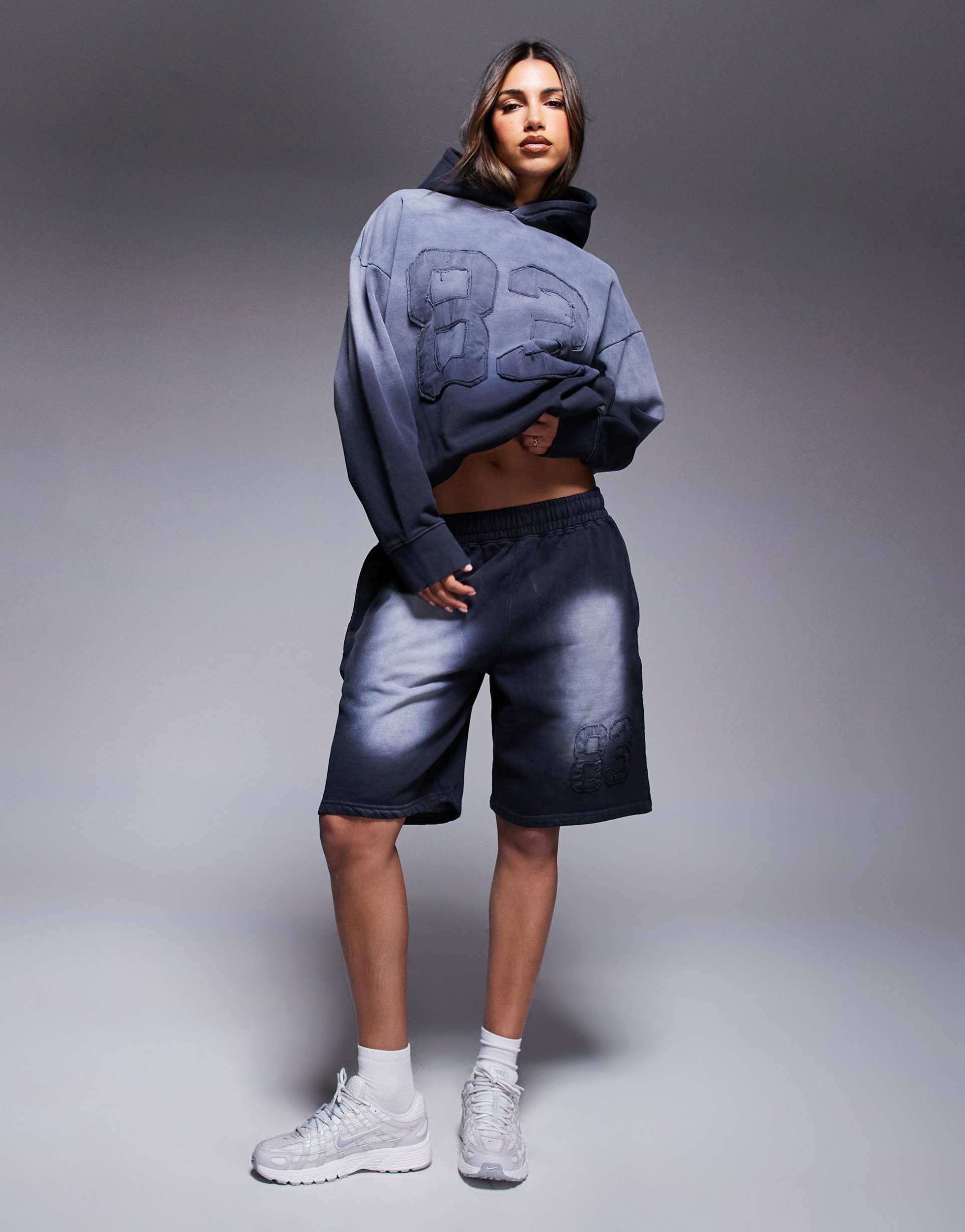 Boldly relaxed and built for everyday ease, these Courtside relaxed raw-hem shorts bring a varsity-ready edge to off-duty looks. Washed black with subtle fading, they sit at mid rise on a soft, elasticized waistband for all-day comfort. Side pockets add practical detail while the raw hem and garment-washed finish give a street-smart, lived-in vibe. Pair with the coordinating sweatshirt for a coordinated set, or mix with tees and sneakers for a carefree weekend vibe. Effortless and versatile, these shorts are designed to move with you—from casual errands to weekend adventures.
