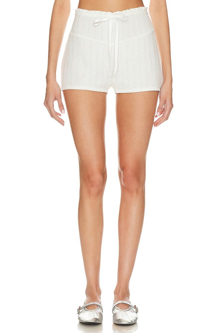 Effortless white romance meets everyday ease in the Allison Short. This pull-on style sits at a comfortable mid rise with an elastic waist, featuring a delicate pointelle knit and a flutter of ruffle trim for a feminine, vacation-ready vibe. A front bow detail adds charm, while the lightweight fabric (a soft blend of rayon, polyester, and a touch of stretch) keeps you cool from sunlit brunch to seaside strolls. Pair with a cropped top or breezy blouse for a casual chic look that moves with you all summer long. Refined, playful, and endlessly wearable.