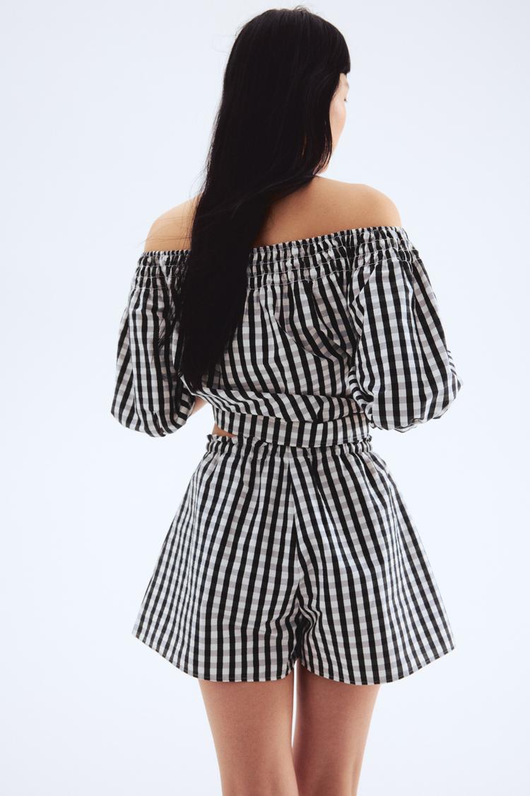 Effortlessly airy cotton drawstring shorts in a timeless black-and-white gingham. The high, ruffle-trimmed waist hugs softly with a hidden elastic to keep you comfortable all day, while a slender drawstring adds a playful, vacation-ready detail. The breathable weave and short silhouette deliver casual-chic appeal perfect for brunch, strolls, or warm-weather escapes. Pair with a cropped top or lightweight blouse for an effortlessly polished look that transitions from day to night with ease. A versatile staple that blends preppy charm with relaxed ease.