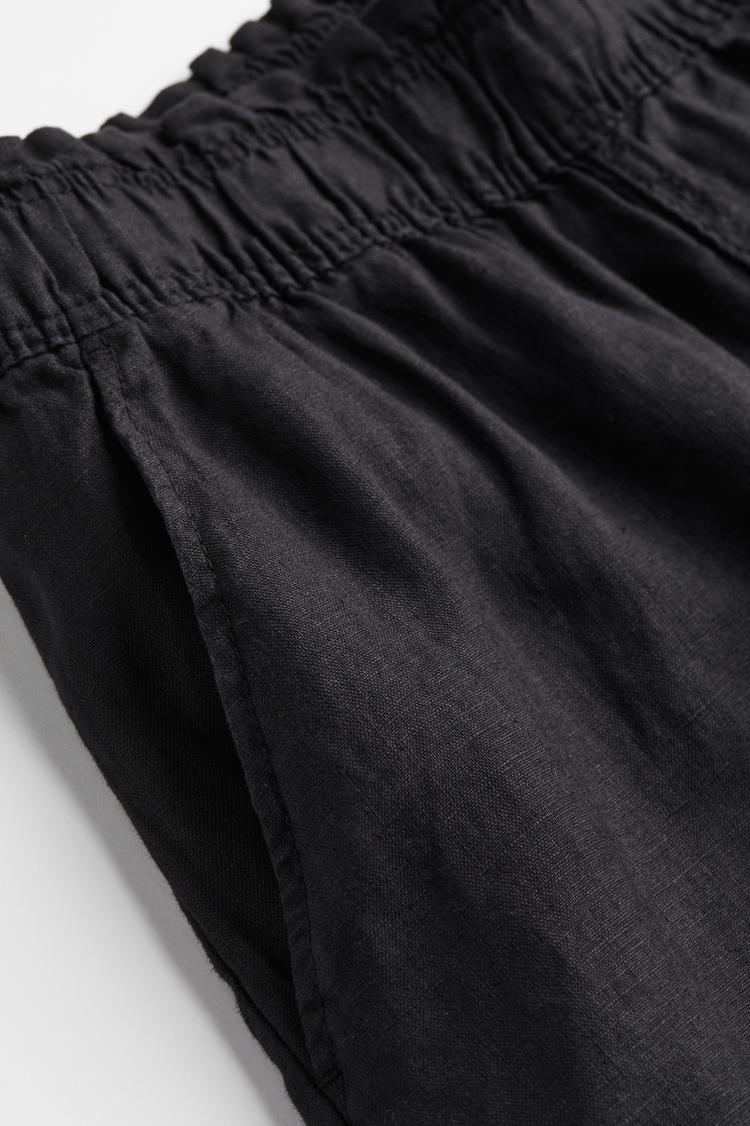 Effortless summer chic meets everyday practicality with these black linen shorts. Tailored for a flattering high-rise, they feature a gathered, covered-elastic waistband finished with a playful ruffle trim. The breathable linen drapes into a relaxed silhouette, while diagonal side pockets provide discreet utility. A clean hem keeps the line streamlined, making them perfect for warm-weather days—from casual brunch to vacation jaunts. Pair with a breezy blouse for daytime ease, then dress up with a satin cami for evening strolls. Timeless, versatile, and endlessly breathable linen.