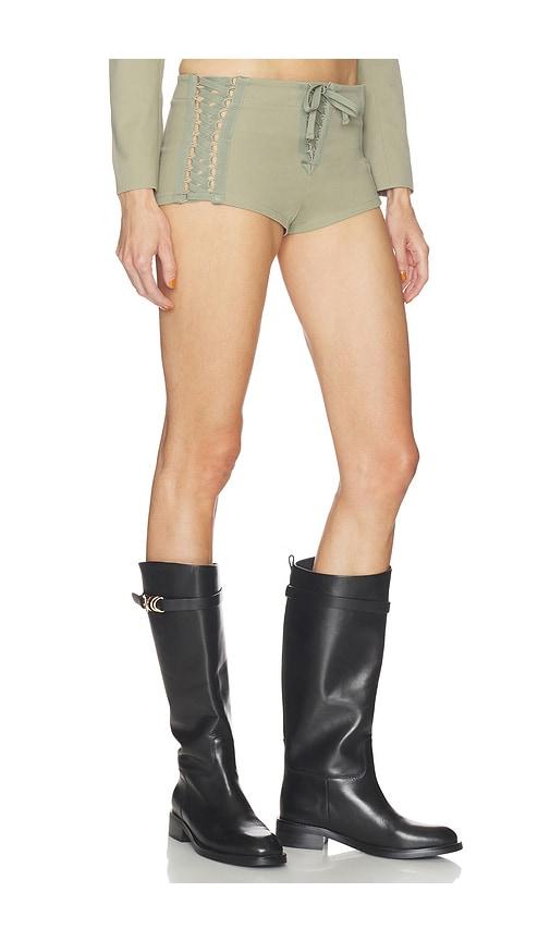 HAELO OPEN LACE UP MICRO SHORTS IN SURPLUS KHAKI IN OLIVE.