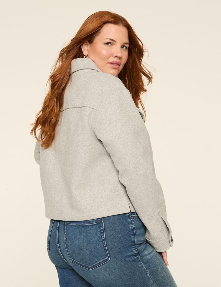 Elevate everyday styling with this plus-size faux-wool short coat. In a soft light heather grey, the classic, not-too-tight silhouette flatters curves while staying comfortable. A clean button-front, a traditional collar, and long sleeves with cuff buttons create a timeless frame. Two chest pockets with button closures add functional polish to the streamlined design. Layer over knits or shirts for work, travel, or weekend errands—from casual to refined looks. The cozy-soft faux-wool feel offers warmth without bulk, making this versatile coat a reliable year-round staple.