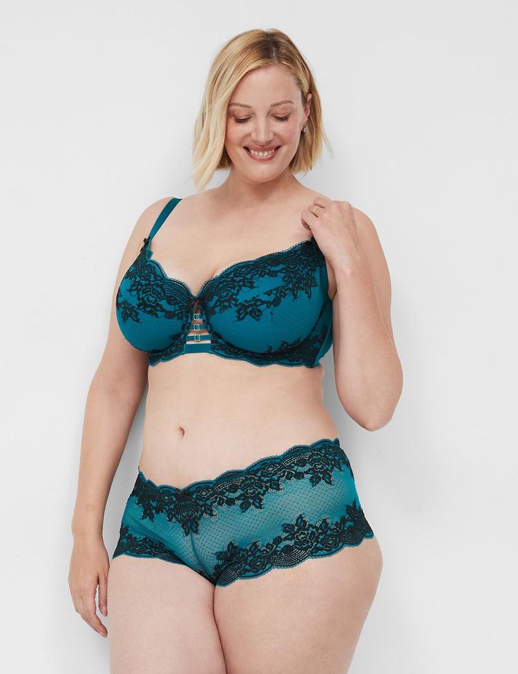 Discover the perfect blend of seductive charm and everyday comfort with this Plus Size Lace Cheeky Short Panty in a rich deep lagoon hue. Crafted from sheer, lightweight lace, it features a mid-rise flat-front waistband and a flattering fitted silhouette that embraces curves. The scalloped hemline adds an elegant, romantic touch, enhancing the delicate floral lace design. Ideal for those who want to feel confident and alluring beneath their outfits, this panty is a versatile staple for any lingerie collection. Elevate your intimates with this effortlessly chic and beautifully detailed piece.