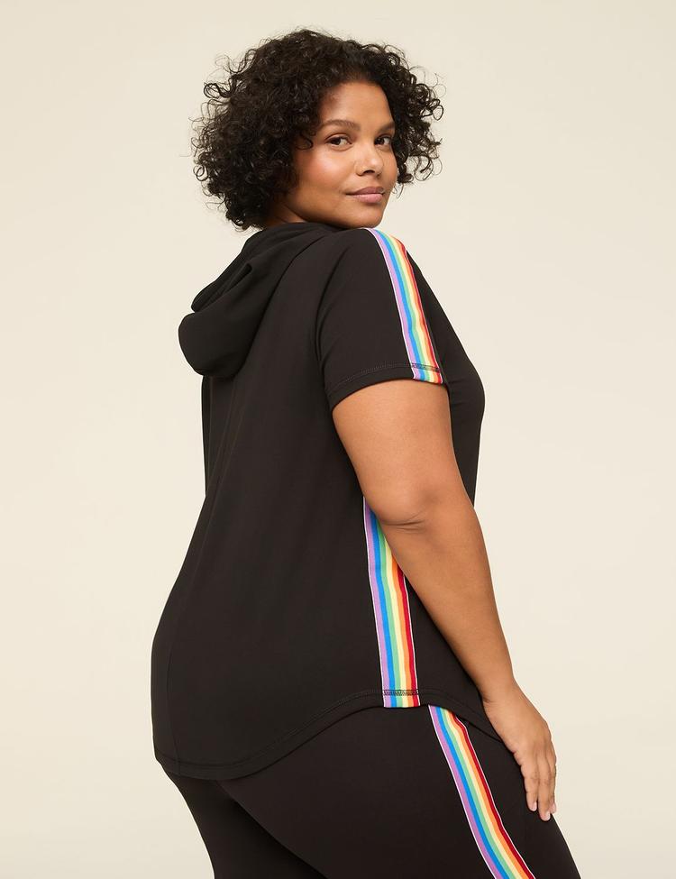 Elevate your everyday with a supremely soft LIVI Short-Sleeve Rainbow-Stripe Hoodie from Lane Bryant. In a deep black base, rainbow side stripes add a bold pop for sport-luxe appeal. Crafted in LIVI Soft—brushed both inside and out with 4-way stretch for effortless movement and all-day comfort—the top drapes with a classic, just-right fit designed for curves. The hooded silhouette features a drawstring, short sleeves, and a curved hem with side slits for easy layering and movement. Eco-friendly, machine-washable, and partially made from recycled plastics, this versatile piece pairs perfectly with leggings or joggers for casual days or travel.