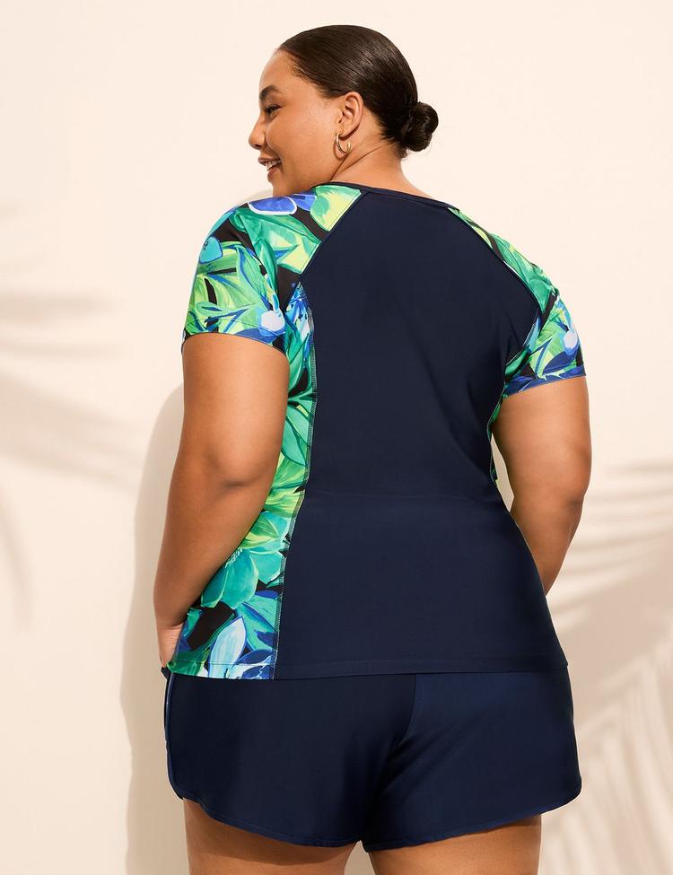 Embrace active comfort and vibrant style with this Plus Size Quarter-Zip Short-Sleeve Rash Guard, perfect for beach days or poolside lounging. Crafted from a stretchy, quick-dry polyester-elastane blend, it features a sleek matte dark blue base with lively tropical floral prints in bright blue and green on the sleeves and side panels. The regular fit and elasticated waistband on the coordinating shorts ensure ease of movement and flattering coverage. Designed with a functional quarter zipper and short sleeves, this set offers both comfort and style for your swim and casual wear needs. Ideal for layering over swimwear, it effortlessly combines performance with playful tropical charm.