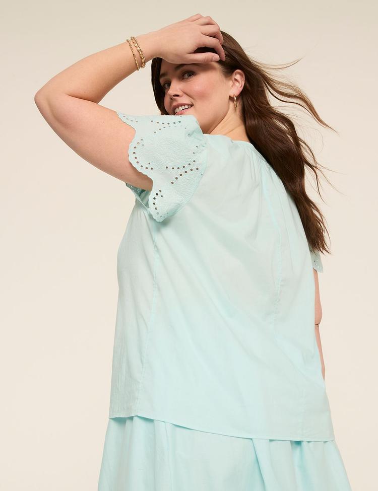 SHORT-SLEEVE NOTCH-NECK EYELET TOP