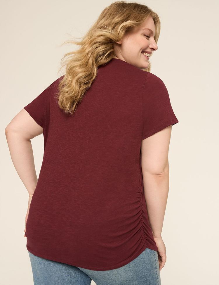 Available in Plus Size The Side-Ruched tee - flattering gathered details give some "wow" to your waist. Now with a shimmery foiled floral graphic for an extra dose of everyday ethereal style. FIT: Classic. Designed for curves and a not-too-tight, not-too-loose, just-right fit. Front Length (On Body): 31.5" (On Size 18) Longer length is perfect for added coverage FEATURES: V-neck Short sleeves Ruching at sides SPECIAL DETAIL: Shimmery foiled graphic FABRIC: Soft, stretchy cotton slub fabric. Machine Wash 100% Cotton Item Number #413448 Imported Plus Size Top ". Plus Size Short-Sleeve Side-Ruched Foiled Floral Graphic T-Shirt, in Windsor Wine, 26/28, Women's, Lane Bryant