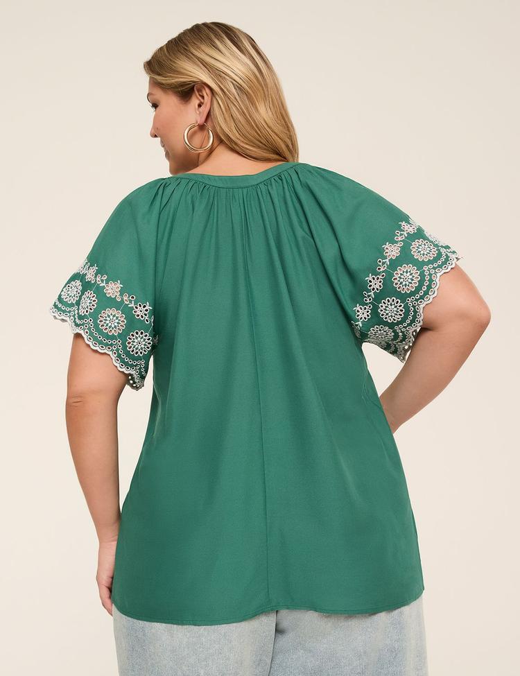 Embrace effortless comfort and timeless style with this Plus Size short-sleeve split-neck top in a rich pine green hue. Crafted from soft, airy viscose with delicate off-white embroidered sleeves, it offers a lightweight and breathable feel perfect for warmer seasons. The classic V-neck split with a subtle tie-up detail adds a touch of femininity, complemented by flutter sleeves that create graceful movement. Designed for a regular, just-right fit, this top pairs beautifully with shorts or capris for casual outings, brunches, or everyday wear. Elevate your wardrobe with this versatile staple that balances comfort with charming embroidered accents.