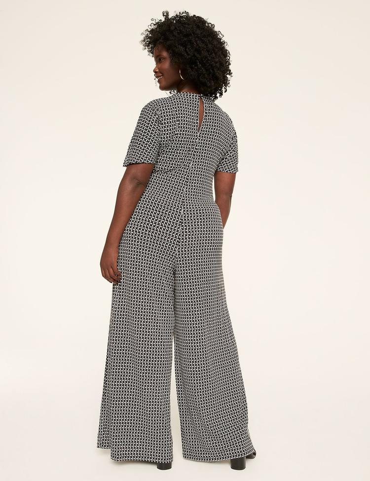 Experience effortless style and comfort with this chic plus-size jumpsuit crafted from a soft, stretchy matte jersey fabric. Featuring a timeless black and white geometric print that covers the entire garment, this jumpsuit offers a classic surplice neckline, short sleeves, and a fitted waist that transitions into relaxed wide-leg pants for an easy, flattering silhouette. The flat-front waistband and button-back closure add polished details while ensuring a comfortable fit. Perfect for casual outings, workdays, or brunch dates, this versatile jumpsuit pairs seamlessly with sneakers or sandals, making it a must-have staple for a modern, stylish wardrobe.