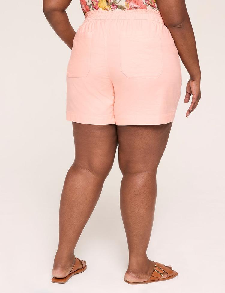 Effortless comfort meets everyday polish with these Slub Pull-On Shorts in a soft peach. Crafted from a breathable cotton-lyocell-elastane blend, they drape with gentle stretch for all-day mobility. A mid-rise, elasticized pull-on waist with a subtle drawstring delivers a smooth, flattering fit, while a relaxed hip-to-thigh silhouette keeps you comfortable from morning errands to sunset strolls. Functional pockets at the fronts and backs add practical ease, finished with a clean hem for a streamlined look. Pair with a breezy top for a versatile warm-weather staple you’ll reach for again and again.