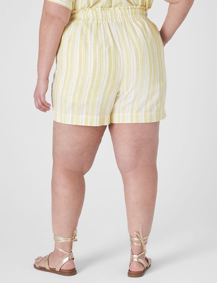 Breathe easy this summer with these Plus Size Soft Stripe Shorts, designed for effortless comfort and classic style. Crafted from a lightweight, breathable linen blend, these shorts feature a relaxed fit and a mid-rise waist with a covered elastic waistband and drawstring for adjustable comfort. The chic yellow and white vertical stripes enhance their timeless appeal, while four functional pockets add practicality. Perfect for casual outings, vacations, or brunch dates, these shorts combine breathable fabric with a flattering silhouette to keep you cool and stylish all season long.