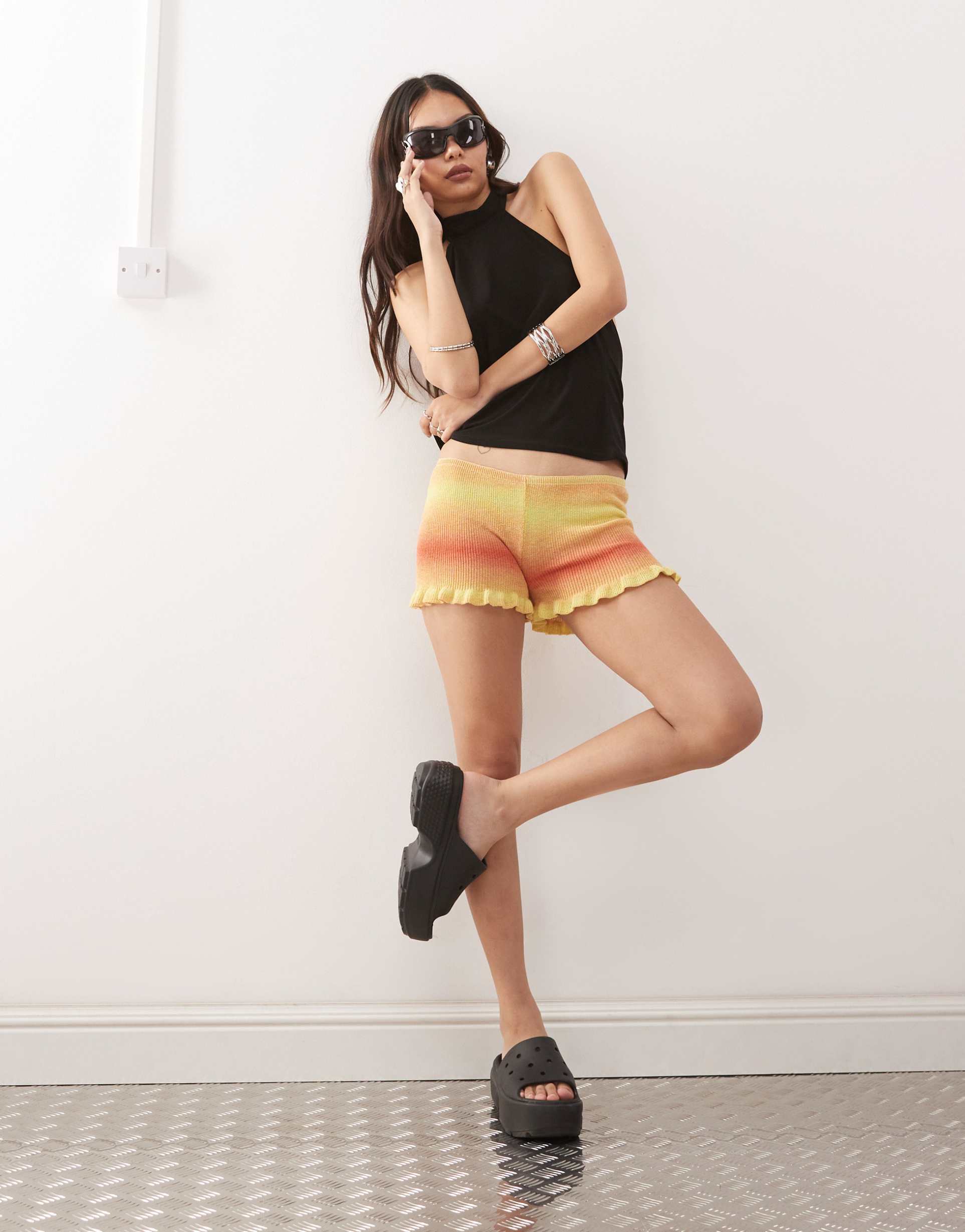 MONKI KNIT SHORTS WITH LETTUCE HEM IN RED AND YELLOW SPACE DYE STRIPE