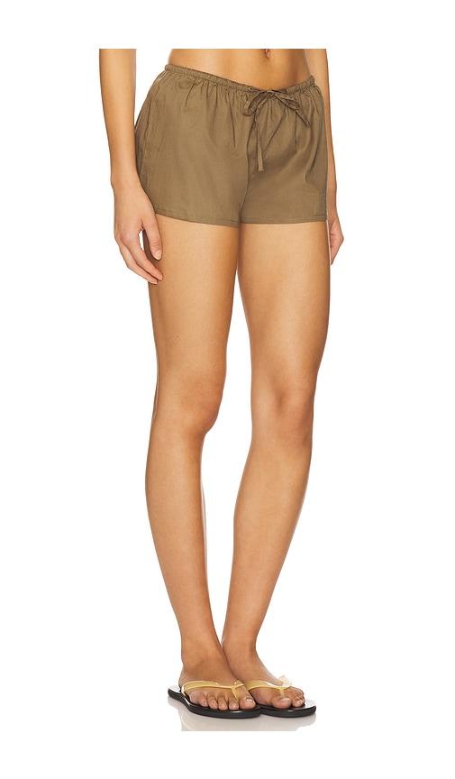 MONTCE LOW-RISE DRAWSTRING SHORTS IN OLIVE.