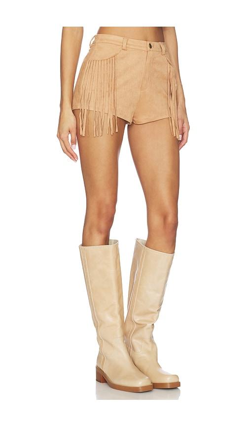 MORE TO COME AUTUMN FRINGE SHORT IN TAN.