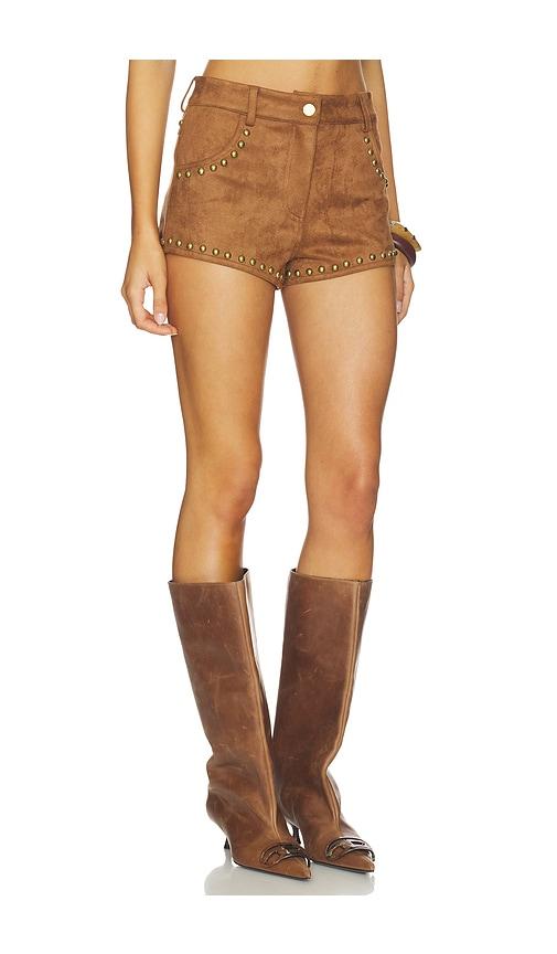 MORE TO COME LEANAN STUDDED FAUX SUEDE SHORT IN TAN.