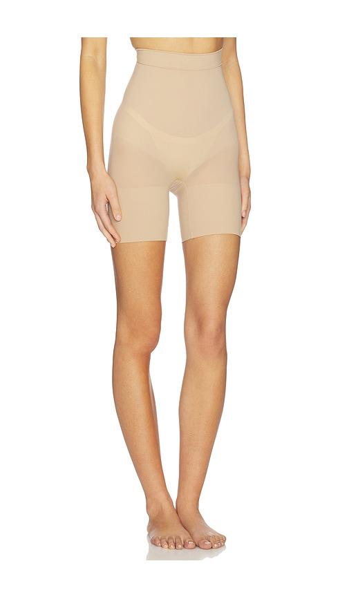 SKIMS SHEER SEAMLESS MID THIGH SHORT IN TAN.