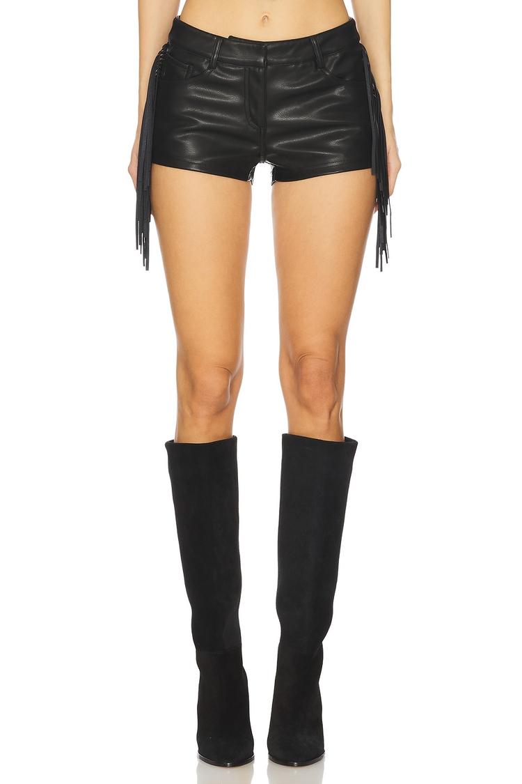 Own the moment with these Karina Fringe Shorts. A bold take on faux leather, the shorts feature dramatic fringe trim along the sides for kinetic movement and a rebellious edge. The close-fitting silhouette wears a zip fly with button closure and a classic four-pocket design, all in a deep black finish that pairs with almost anything. The 23 cm inseam creates a confident, festival-ready look that still works for nights out and streetwear styling. Team with a cropped top and tall boots for a chic, modern outfit or dress them down with a slouchy tee for everyday attitude.