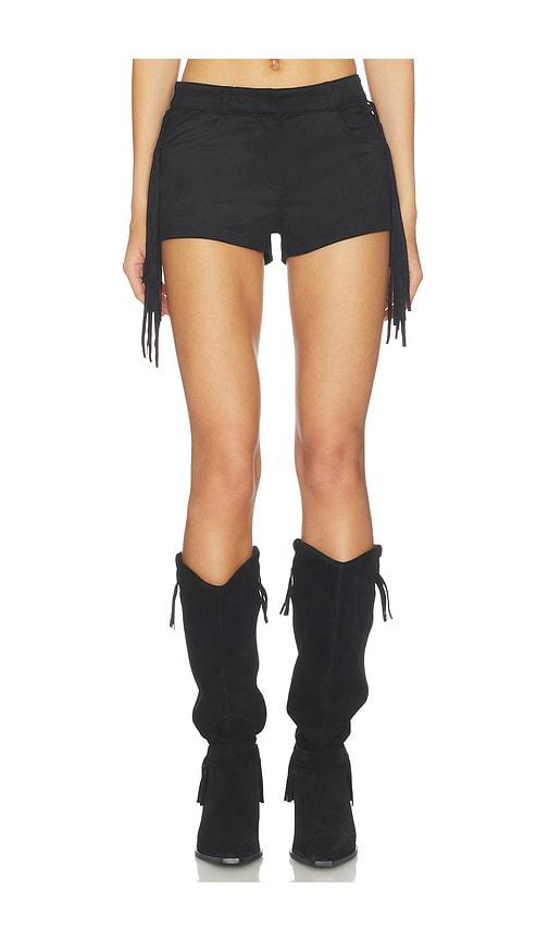 SUPERDOWN KARINA FRINGE FAUX SUEDE SHORT IN BLACK.