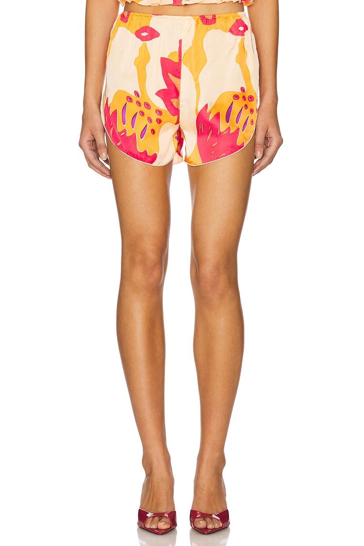 Move into summer with a sun-kissed vibe in these high-waisted satin shorts. The pull-on silhouette sits sweetly at the waist with an elastic band for day-long ease, while the lightweight viscose satin drapes softly over your legs. A tropical floral print in coral pinks and zesty oranges covers the all-over fabric against a creamy base, delivering a vacation-ready statement. Pair with a crisp white blouse and sandals for brunch, or style with a silk camisole and heels for evenings out. Made in Indonesia, this versatile staple pairs comfort with standout charm for warm-weather wardrobes.