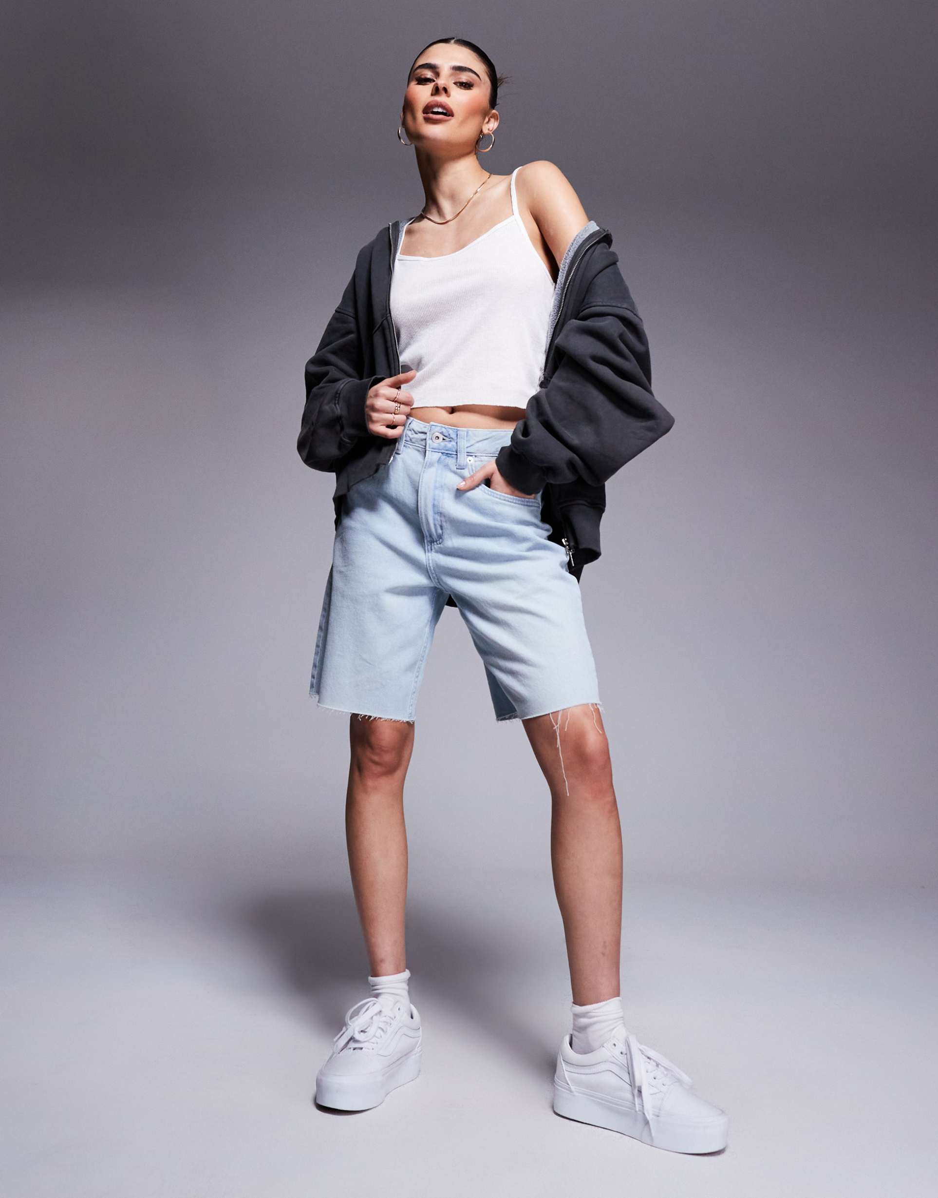 Effortless weekend staple: Vans Sirelle cut-off jorts in a pale-blue denim that pairs with a white tee and a bomber for an elevated casual vibe. The high-rise waist flatters the silhouette while belt loops and a classic five-pocket layout keep the look authentic. Featuring a raw-cut hem, these non-stretch denim shorts offer a breezy, lived-in feel perfect for sun-soaked days, concerts, or street-style runs. Wear them with sneakers or slides for a laid-back, modern 90s-inspired look. A versatile essential that transitions from morning coffee runs to sunset rooftop hangs.