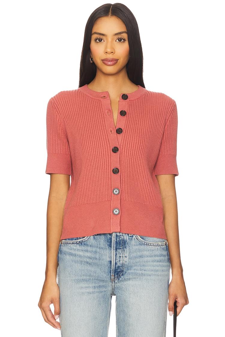 Embrace timeless elegance with this fitted short sleeve cardigan in a matte dusty coral hue. Crafted from a soft knit blend of viscose, polyester, and nylon, it features a ribbed trim and a neat front button closure, delivering subtle texture and refined detail. This versatile piece pairs effortlessly with casual denim or tailored bottoms, making it an essential staple for spring and autumn wardrobes. Perfect for everyday wear or a minimalist layered look, it blends comfort with classic style for a polished yet relaxed silhouette.