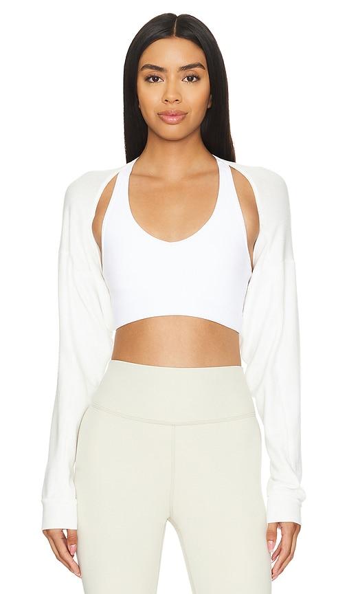 BEYOND YOGA DUET 2 WAY CONVERTIBLE SHRUG IN WHITE.
