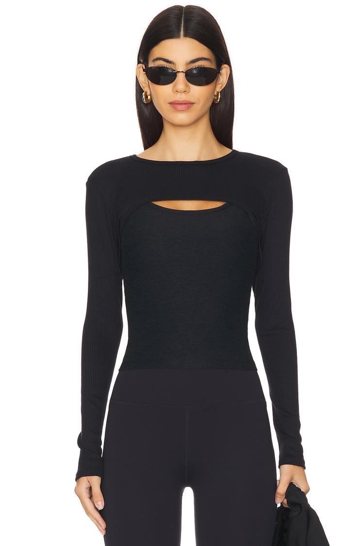 Effortless layering defines this minimalist black shrug crafted from a soft modal-elastane blend. Featuring a close fit and long sleeves with a classic round neckline, it offers waist-length coverage ideal for transitional weather. The subtle cutout detail at the front adds a contemporary twist to this ribbed jersey piece. Perfect for casual outings, loungewear comfort, or travel ease, it pairs seamlessly with a variety of looks, delivering both style and versatility in one sleek silhouette.