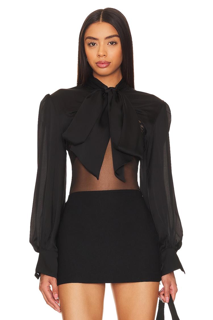 Sleek matte black silk in a slim-fitting blouson silhouette defines this pussy bow shrug. The long puffed sleeves with button cuffs add a romantic touch, while the sheer panels at the bodice and back create a daring, sexy statement. The elegant tie neck brings a soft draped effect to the neckline. Waist length and button closure offer a polished finish, making it perfect for date nights, night outs, or casual chic events. This piece embodies a sophisticated and alluring vibe with luxurious silk fabric at its core.