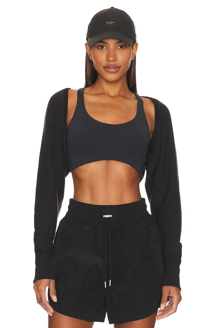 This cropped bolero shrug in black cotton features a close fit with long sleeves and a round neckline. Its open front design and ribbed trim at the borders and cuffs add subtle sporty chic details. The fleece lining ensures comfortable warmth, making it perfect for casual wear, athleisure, and workout layering. Its minimalist style and regular sleeve styling complement various casual and loungewear outfits seamlessly.