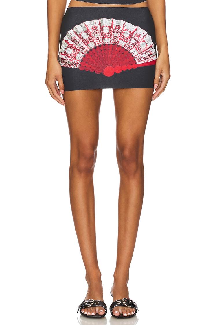 Elevate your warm-weather edits with this Kitana Mini Skirt. A sleek black base anchors a bold red and white fan motif that wraps across the back and side panels, delivering graphic drama without overpowering. Crafted in a stretchy polyester-spandex blend, it hugs the silhouette in a slim-fit, pull-on design with a wide elastic waistband for all-day comfort. Unlined and finished with a raw-cut hem, it moves with you from sunlit brunches to late-night city outings. Dress it up with a crop top and heels or keep it cool with sneakers for versatile, head-turning style.