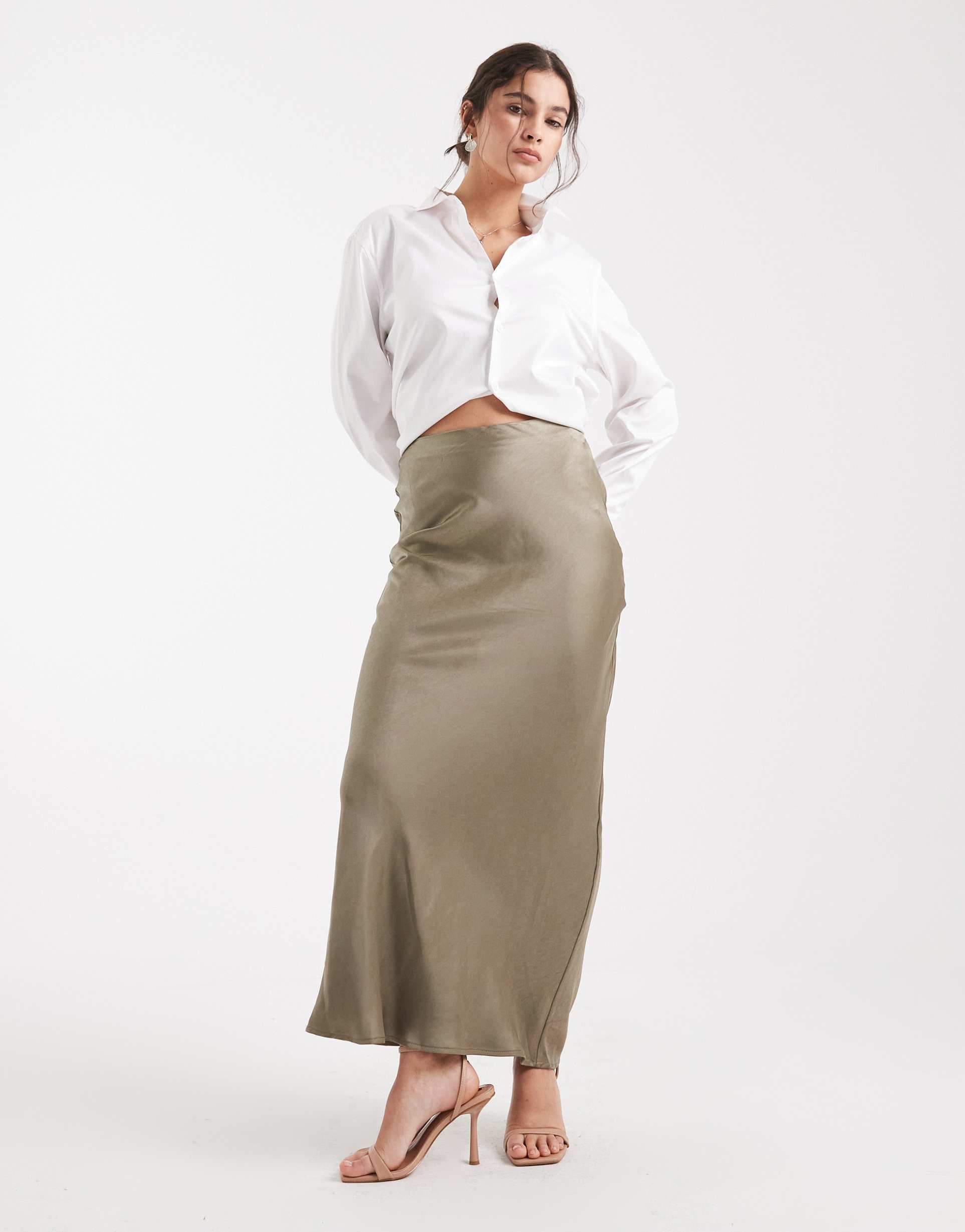 4TH & RECKLESS SATIN COLUMN MAXI SKIRT IN OLIVE