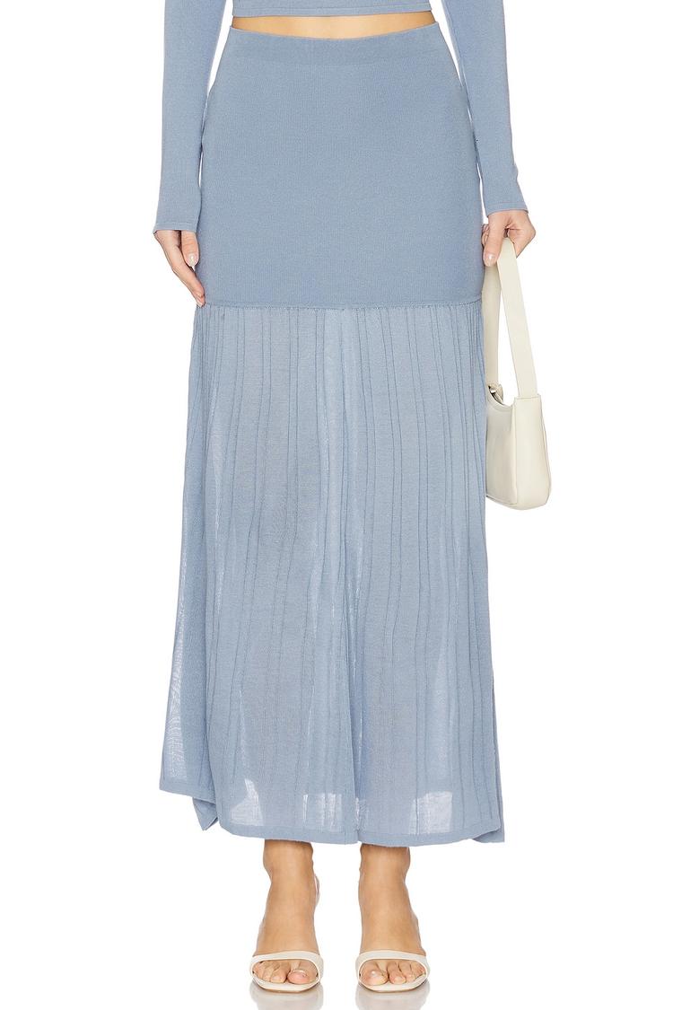 light blue knit maxi skirt with pleated sheer hem