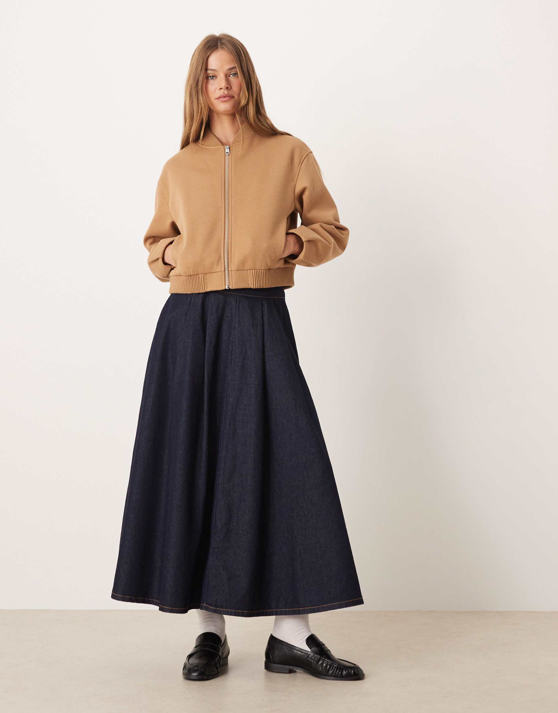 Effortless everyday polish meets retro flair with this ASOS DESIGN denim circle skirt in a rich rinse wash. Cut in a high-rise silhouette from sturdy 100% cotton denim, it swings into a full circle and features a flattering pleated waist that adds subtle movement. A clean back zipper preserves a sleek line, while the regular fit and midi length pair perfectly with tights, boots, or sneakers. Dress it up with a silk blouse for brunch, or keep it casual with a chunky knit and loafers for a weekend look. A versatile denim staple with timeless appeal.