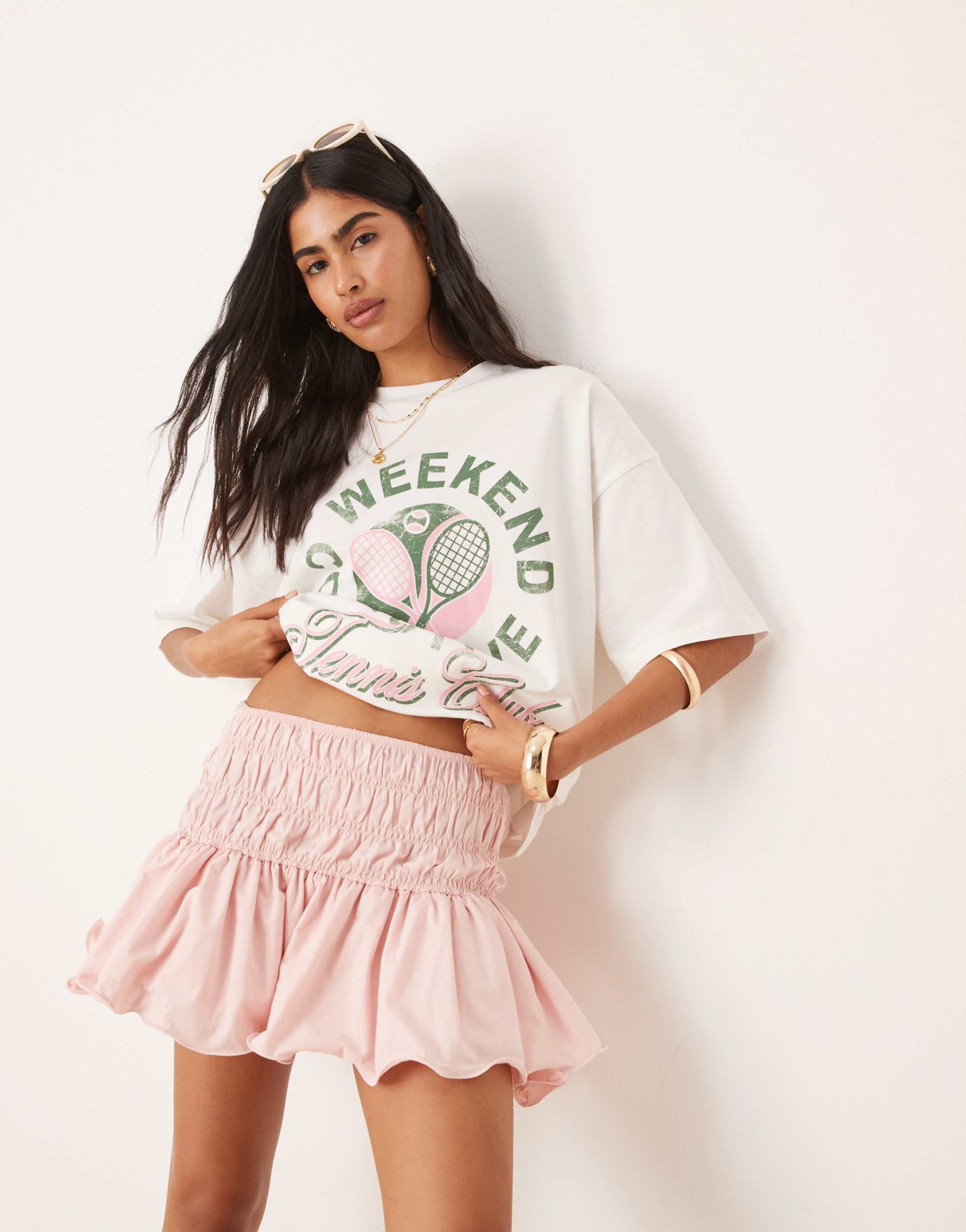 Effortless, sun-kissed couture meets everyday comfort in this ASOS DESIGN pink mini skirt. Crafted from plain-woven cotton, the high-rise smocked waistband creates a secure, stretchable fit while the gathered, drop-waist flare falls into playful layered ruffles that move with every step. The soft pastel pink shade reads fresh and versatile, pair with a graphic tee for weekend errands or dress up with a crisp blouse for brunch or date night. A true wardrobe staple that blends whimsy with ease, this cotton mini is your go-to for feminine, carefree styling.