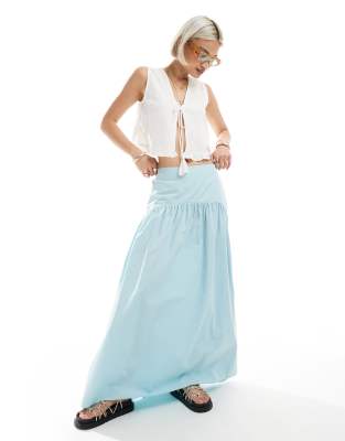 Effortless, sun‑kissed elegance defines this ASOS DESIGN dropped waist maxi skirt in blue. Crafted in plain-woven polyester, it flows to a full‑length, relaxed silhouette with a soft gathered drop at the waist for easy movement. The cool blue hue pairs perfectly with cropped tops or knits, making it ideal for spring and summer days—from brunch and markets to beach towns. A pull‑on, elasticated waist ensures day‑long comfort, while the clean hem keeps the look streamlined. Dress it up with a belt and sandals or keep it casual with flats—the versatile maxi anchors warm‑weather wardrobes with polish and ease.