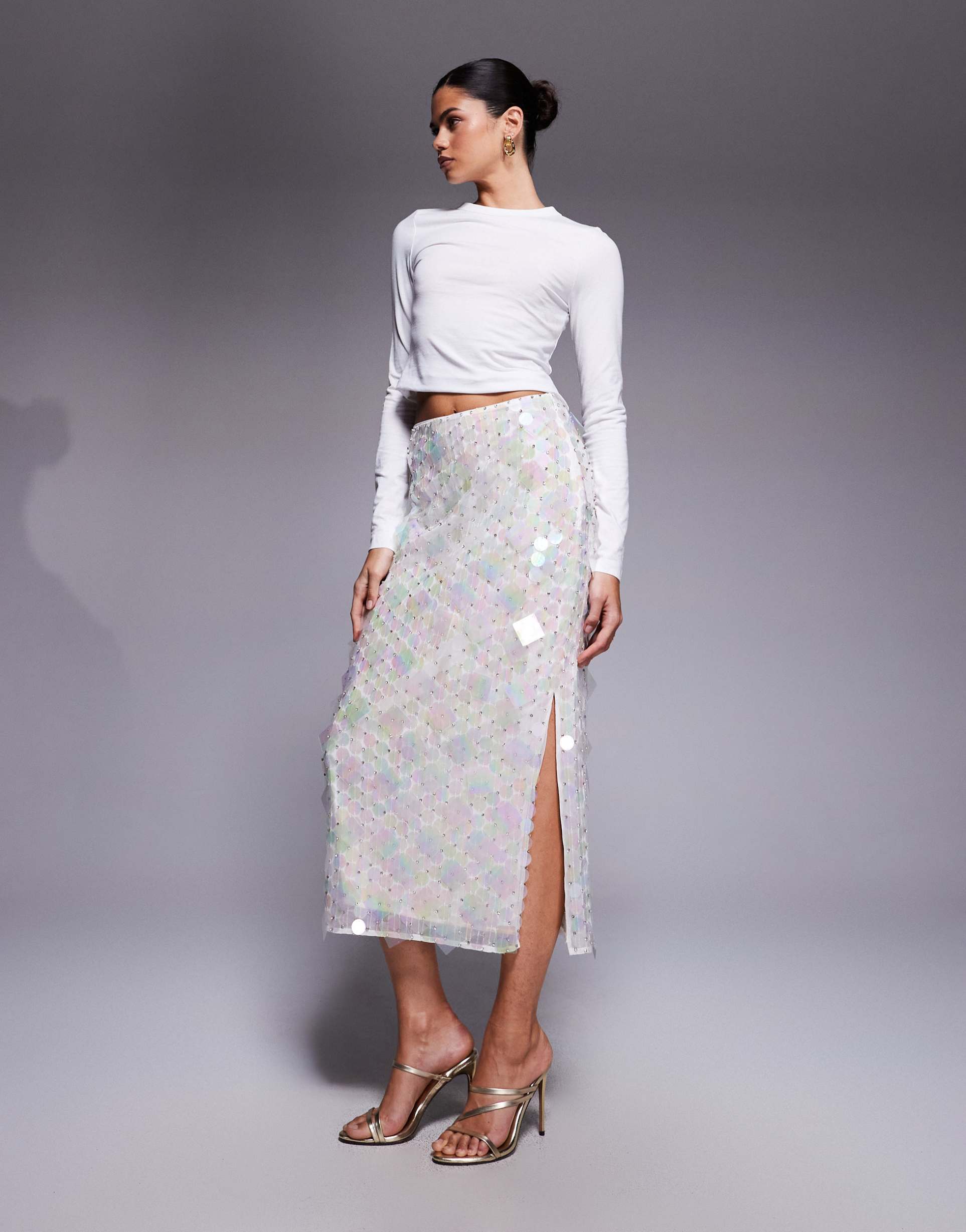 ASOS DESIGN EMBELLISHED DISC SEQUIN MIDI SKIRT IN WHITE