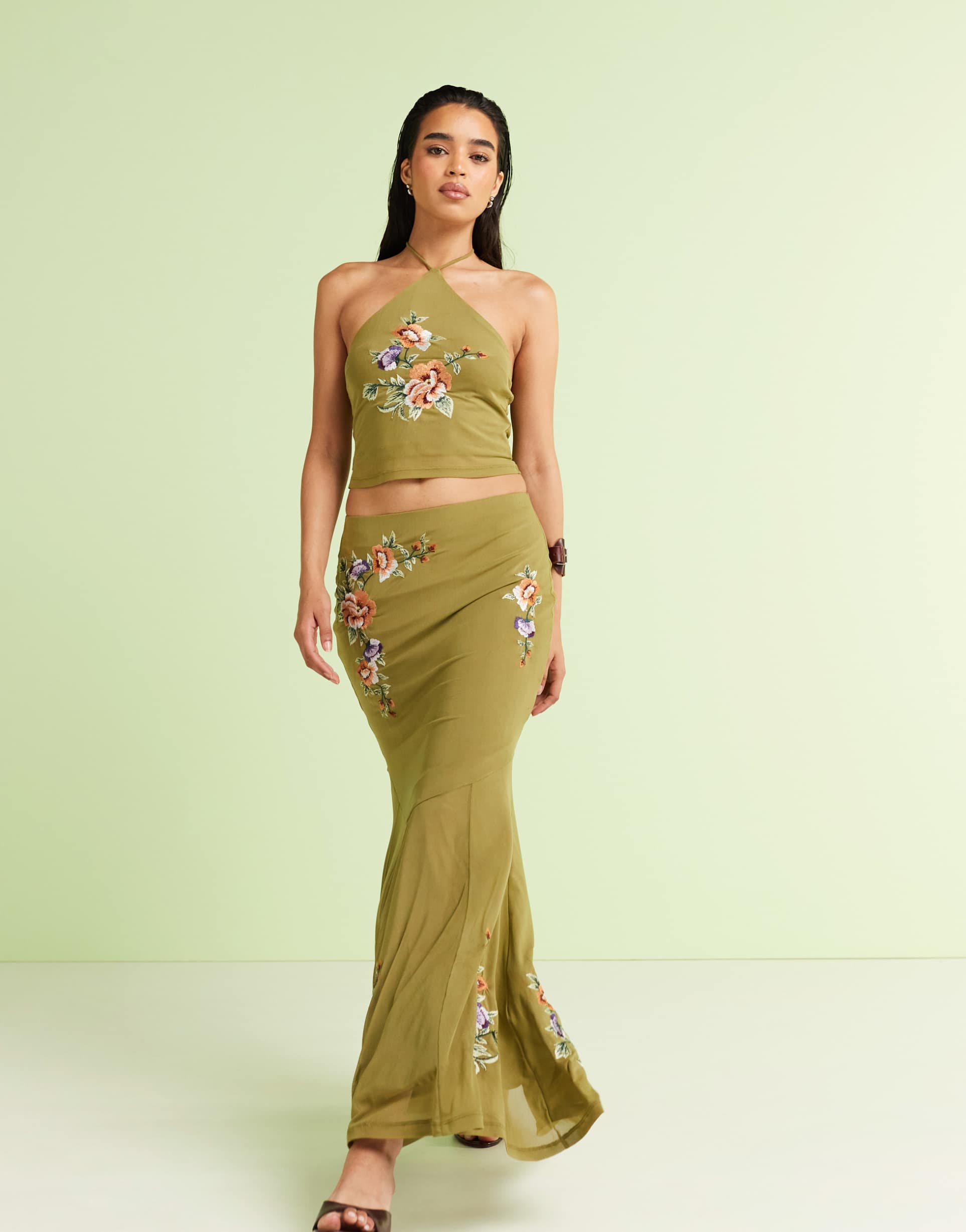 ASOS DESIGN EMBROIDERED FISHTAIL MAXI SKIRT IN GREEN - PART OF A SET