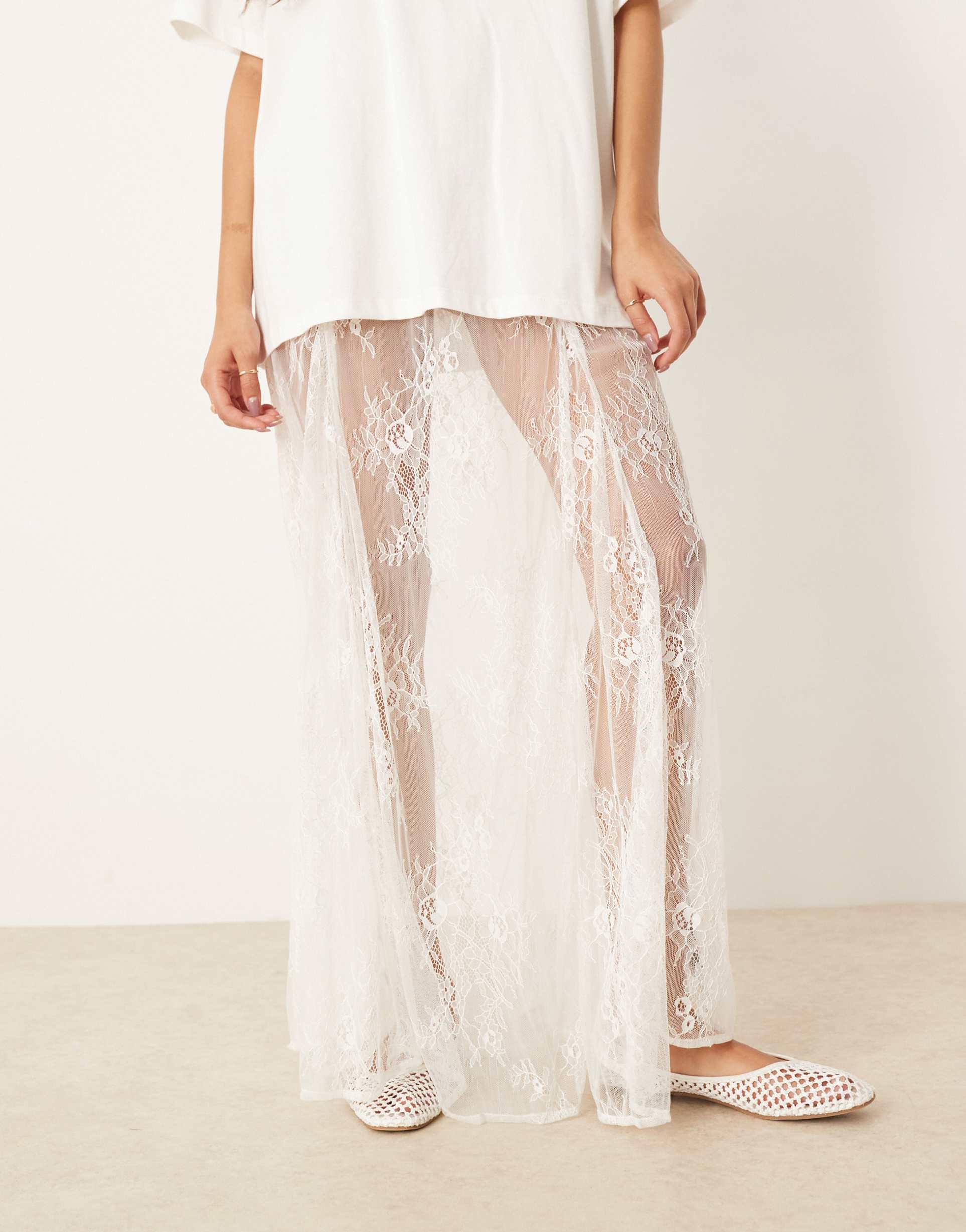 ivory lace maxi skirt with a high-rise elastic waist