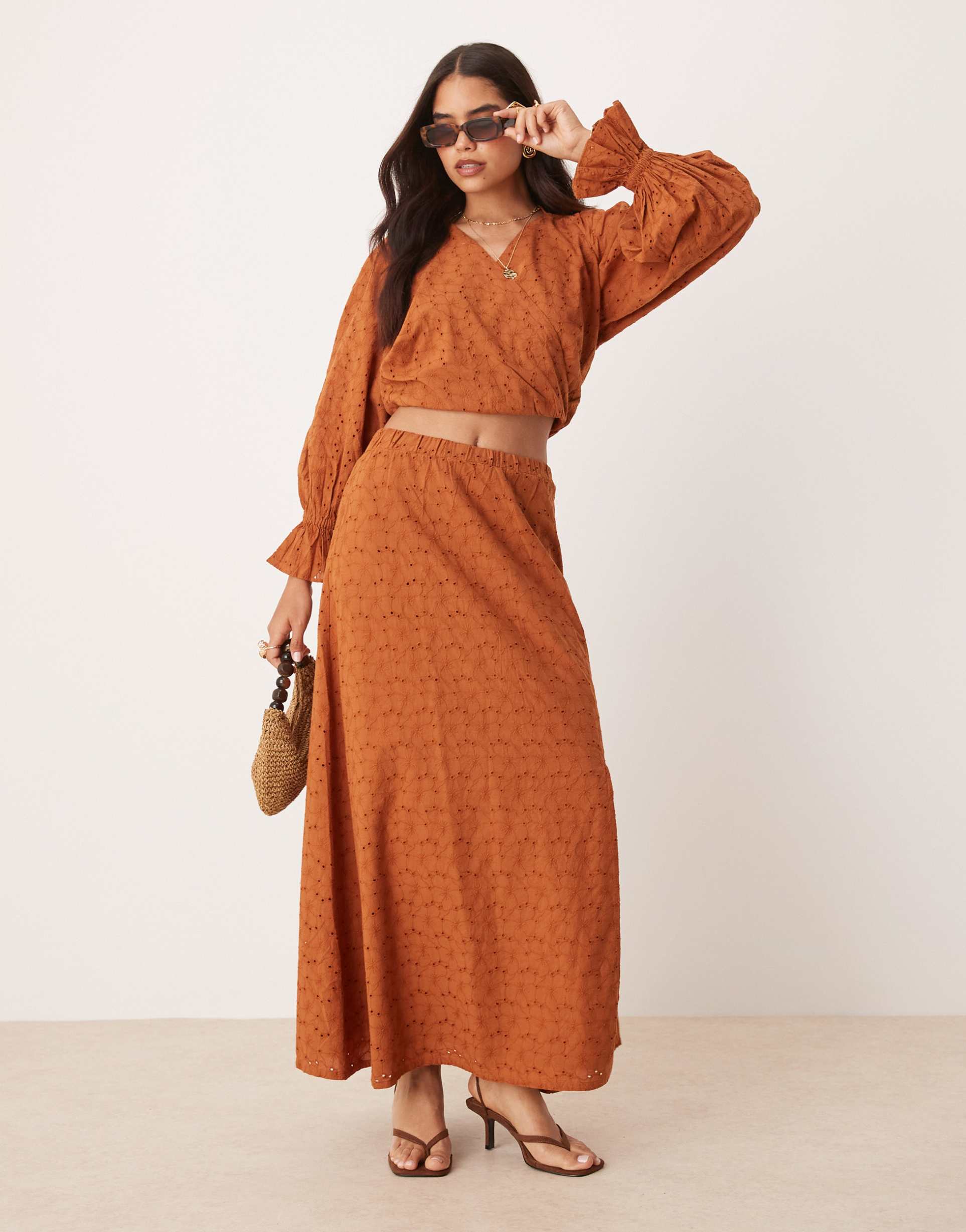 ASOS DESIGN PREMIUM EYELET DROPPED WAIST MAXI SKIRT IN BROWN - PART OF A SET