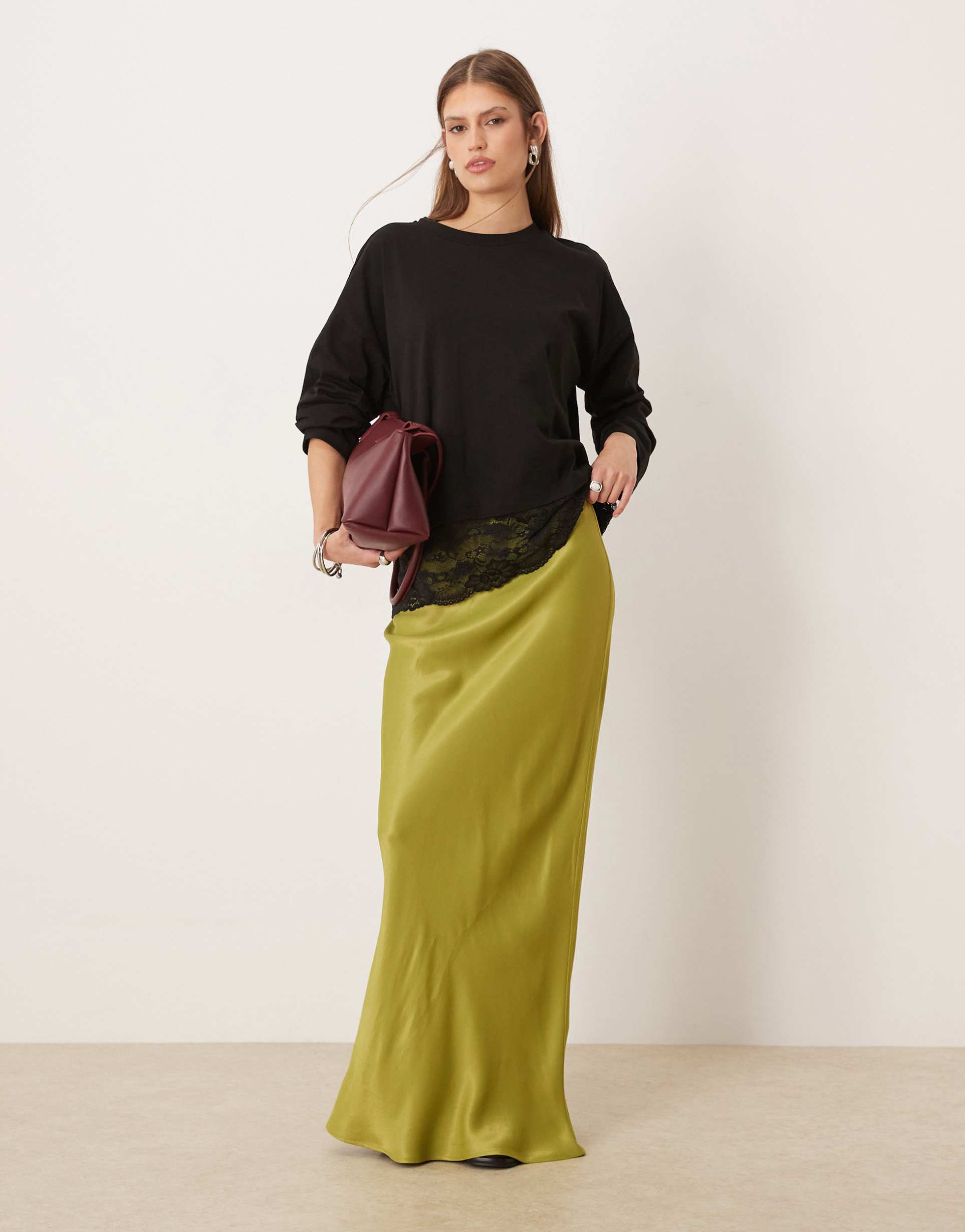 ASOS DESIGN SATIN BIAS MAXI SKIRT IN OLIVE